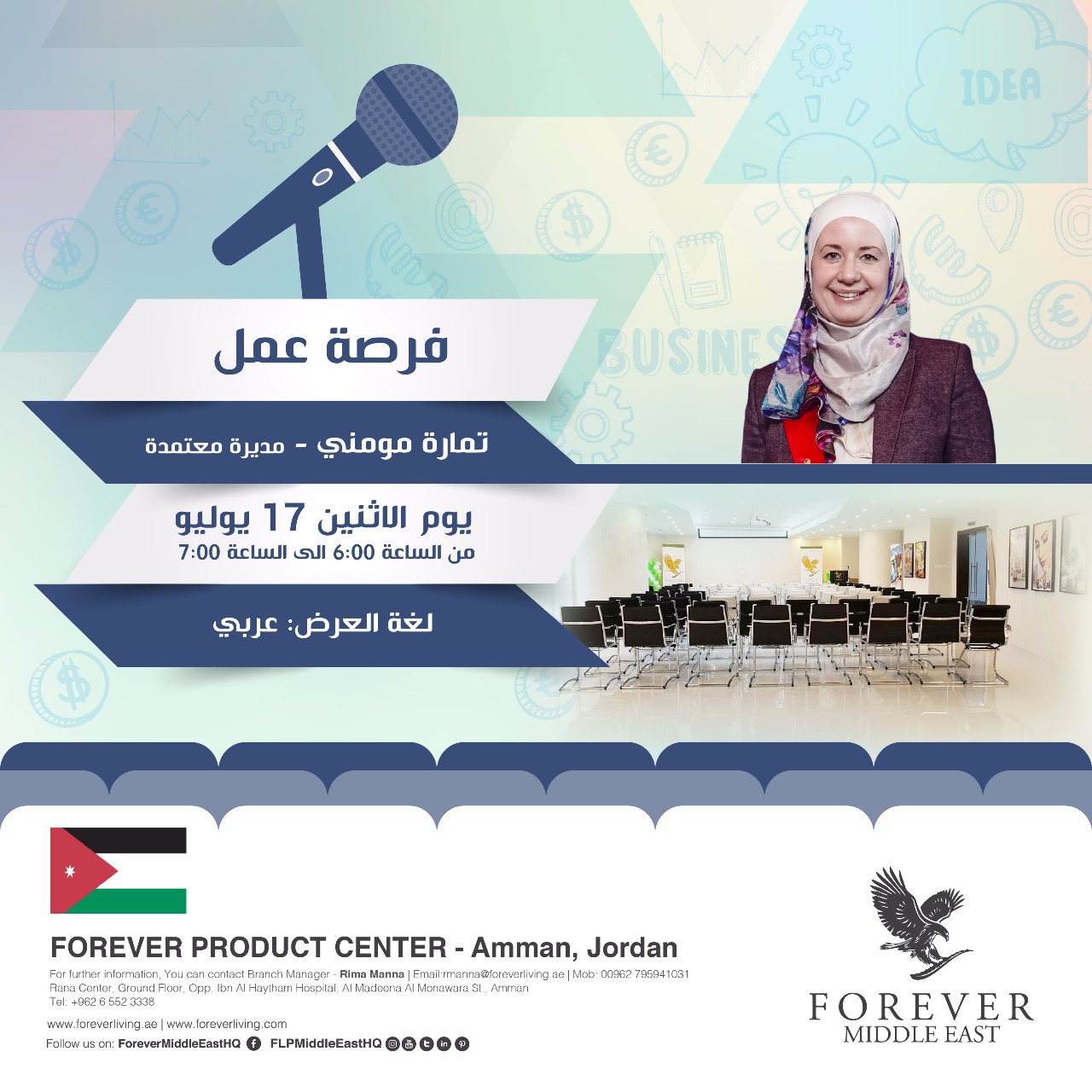 فرصة عمل Training details Monday | 17 July,2017 6:00PM - 7:00PM FOREVER LIVING PRODUCTS - JORDAN ( AMMAN ) +96265523338 rmanna@foreverliving.ae تمارة مومني - مديرة معتمدة لغة العرض - عربي